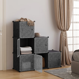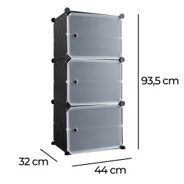 Dulapul este format din trei module încăpătoare care pot fi dispuse vertical, orizontal sau în diferite configurații - ajustându-și dispunerea la spațiul disponibil. Fiecare modul are o ușă care se deschide lateral, facilitând accesul la conținut și economisind în același timp spațiu în cameră.
