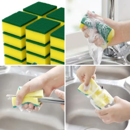 Bureții de bucătărie universali de 9 x 6 x 3 cm sunt o piesă esențială pentru fiecare bucătărie. Aceștia se vor dovedi utili atât pentru spălarea zilnică a vaselor, cât și pentru îndepărtarea murdăriei mai dificile de pe oale, cratițe, blaturi de lucru sau chiuvete. Datorită designului lor clasic și dimensiunilor optime, bureții sunt confortabili de utilizat și stau bine în mână.